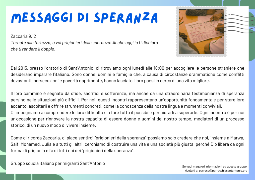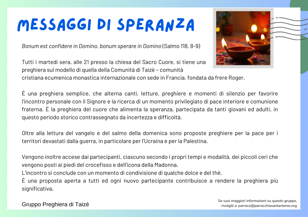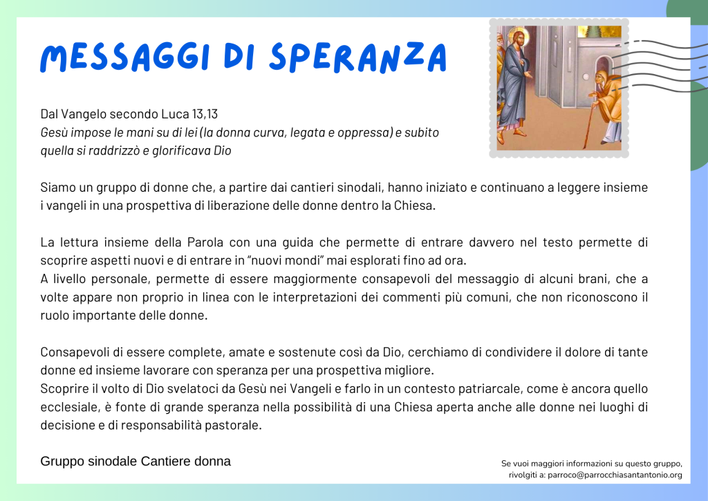 Il cammino giubilare che stiamo percorrendo quest’anno è un’occasione per esercitarci a sperare e per condividere i semi di speranza che abbiamo la grazia di vivere anche nelle nostre parrocchie. Per questo il Consiglio pastorale parrocchiale proporrà di tanto in tanto alla comunità le testimonianze raccolte nei diversi gruppi. Li troverete qui di seguito, ma anche in forma di cartolina sui tavoli e nel pannello in fondo alla chiesa e nel canale Telegram.