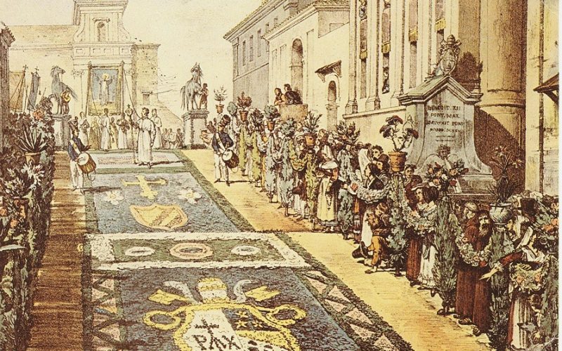 Solennità del Corpus Domini – In copertina proponiamo un’immagine della tradizione popolare delle processioni del Corpus Domini, tratta dalla raccolta di disegni di Antoine Jean-Baptiste Thomas (1823). Egli scrive: “a Gennesano (Genzano di Roma), un piccolo paese sulle rive del lago di Nemi, una solenne processione avanzava su tappeti di fiori artisticamente preparati e composti principalmente da disegni di stemmi. È uno spettacolo molto grazioso, ed è per questo che la festa è conosciuta come l’Infiorata o Festa dei Fiori.”
